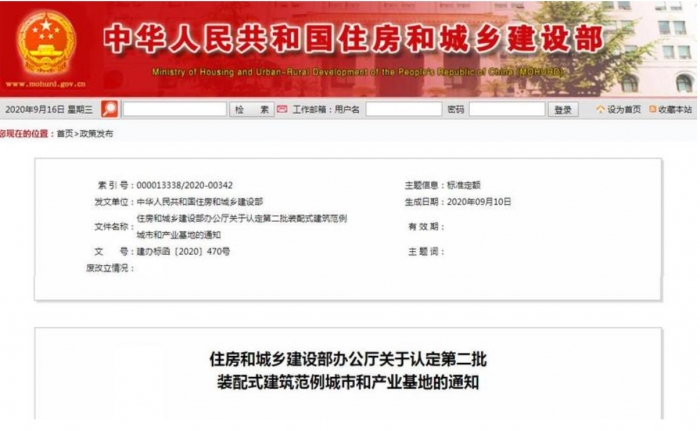 9月15日,住建部認定西安市等18個城市為第二批裝配式建筑范例城市,天津市現(xiàn)代建筑產(chǎn)業(yè)園區(qū)等12個園區(qū)、北京建工集團有限責任公司等121家企業(yè)為第二批裝配式建筑產(chǎn)業(yè)基地。