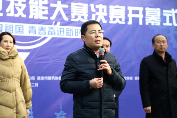 共青團延安市委書記高曉斌,陜建集團黨委組織部、人力資源部部長韓軍鋒,陜建集團黨委組織部副部長、團委書記吳征,延安市人力資源和社會保障局副局長李錦保,延安市住建局副局長郭毅,延安市建筑業(yè)協(xié)會副會長謝萬春出席決賽開幕式。
