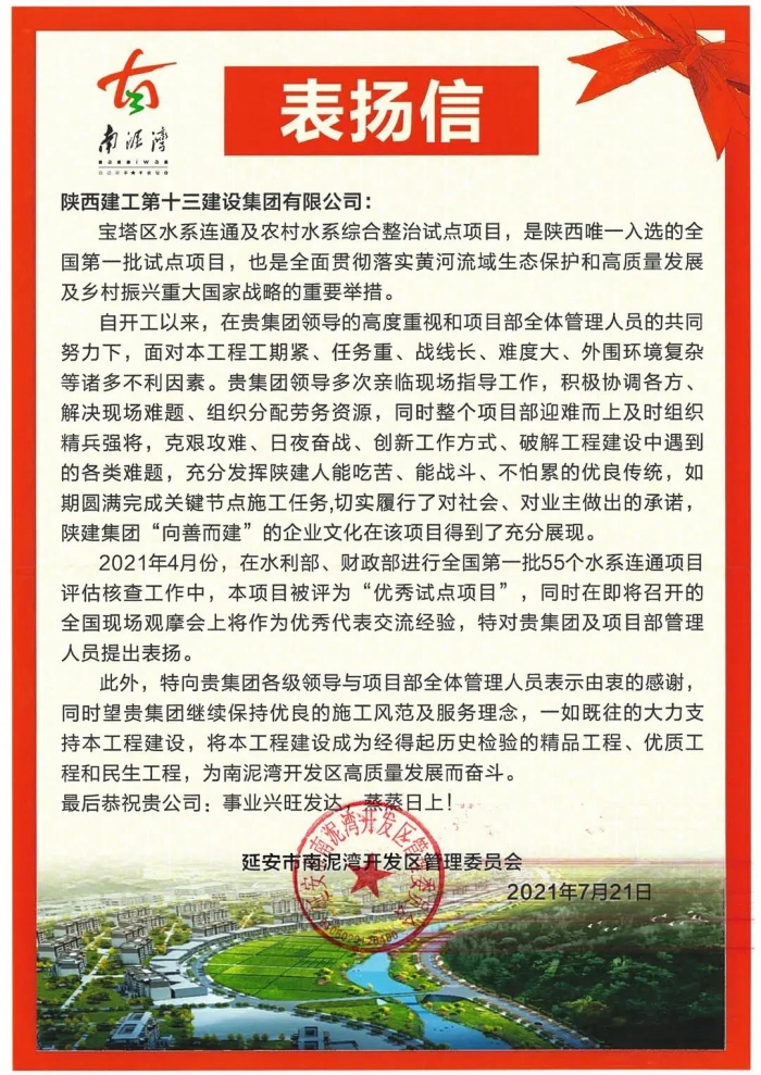 近日,陜建十三建集團收到了來自南泥灣開發(fā)區(qū)管委會的表揚信。信中,對集團寶塔區(qū)水系連通及農村水系綜合整治試點項目全體管理人員表示了高度贊揚。