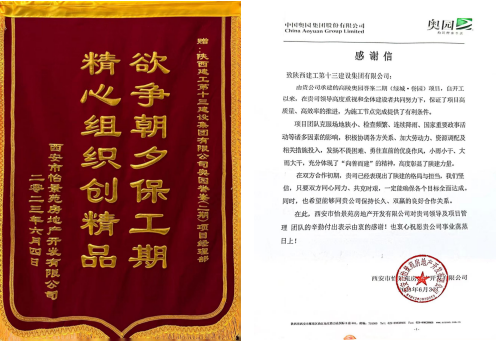 信中提到,陜建十三建集團(tuán)自承建奧園譽(yù)峯(二期)項(xiàng)目以來(lái),重合同、守信用,各項(xiàng)管理工作有序開展,項(xiàng)目建設(shè)穩(wěn)步推進(jìn)。在項(xiàng)目建設(shè)期間,項(xiàng)目全體參建人員認(rèn)真籌劃部署,緊盯目標(biāo)任務(wù),抓進(jìn)度趕工期,主動(dòng)攻堅(jiān)克難,增加資源投入,積極配合工程業(yè)主、監(jiān)理單位和行政管理部門,以不畏艱難、勇挑重?fù)?dān)的精神,為施工節(jié)點(diǎn)完成提供了有利條件。